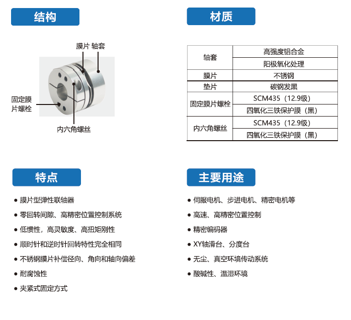 DFPA-C系列聯(lián)軸器采用高強度鋁合金材料,經(jīng)過陽極氧化處理,廣泛用于伺服電機、步進電機、精密電機等。