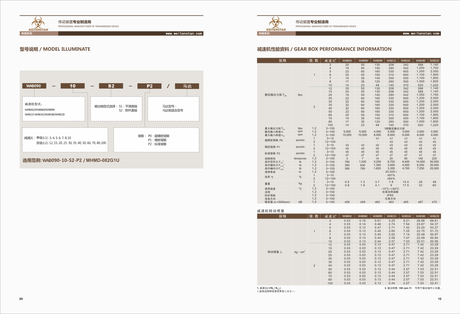 WAB系列機器人專用RV減速機。 齒輪材料采用優質合金鋼,經碳-氮共滲處理,從而獲得最佳的耐磨性和耐沖擊韌性。 利用ANSYS技術對齒輪強度進行有限元分析,同時對齒面形及導程修整,以減低齒輪嚙合的沖擊和噪音,增加齒輪系的使用壽命。 輸出行星架采用一體式(雙支撐)的結構設計,前后軸承大跨距分布箱體內,形成穩定的一體式結構,以確保較高的扭轉剛性和精度。 齒圈與輸出殼體采用一體化設計,采用優質鋼材,經熱鍛成形,從而獲得較高的材料密度。一體化設計能確保所有幾何尺寸一次性加工完成,與其它內嵌式、夾裝式等結構相比具有更高的精度和強度。 輸入軸與鎖緊裝置采用一體化設計,雙螺栓對稱分布,達到動平衡的同時,通過雙螺栓的強力鎖死,有效防止電動軸傳動打滑,實現高精度零背隙的動力傳送。